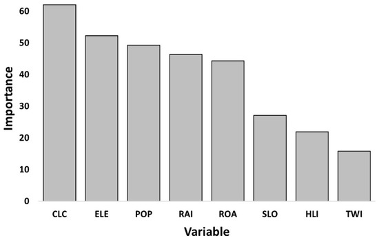 Importance rate of variables in random forest (RF) models of combined fires (grey). Variables are: CLC = Corine Land Cover, including nine land cover categories; ELE = Elevation; POP = population density; RAI = distance to railroads; ROA = distance to roads; SLO = Slope; HLI = Heat Load Index; TWI = Topographic Wetness Index.
