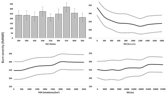 Our modelling approach included land cover, anthropogenic variables and topography as possible drivers of burn severity. Its assessment in human-shaped landscapes is a very complex task because of the heterogeneity of structure and environmental constraints of landscape mosaics and of the poorly explored role of anthropogenic factors (e.g., population density and infrastructures). Our model showed that land cover was the most influential variable affecting burn severity. Several studies have highlighted the relevance of land cover, pre-fire vegetation types and greenness on burn severity in Canadian and Mediterranean forests [86,87]. Even if a metric of pre-fire vegetation cover/greenness such as NDVI can be a suitable predictor of burn severity, we used discrete data showing pre-fire types of land cover. The highest mean severity was found in conifer forests (RdNBR = 357), followed by shrublands (RdNBR = 293) and mixed forests (RdNBR = 288). It is well known that vegetation type is one of the main factors controlling burn severity computed with remotely sensed NB [40]. Conifer forests are more flammable than broadleaf forests due to their higher content of resins, terpenes and their lower foliage moisture content [88], leading to possible higher rates of burn severity, as detected by other studies in Mediterranean ecosystems [89]. Extended shrub cover can foster fire spread and burn with high severity.