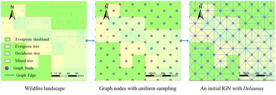 When there are various fuels or variable slopes on a graph edge, it indicates the heterogeneity problem. To address this problem, we implement an IGN generation algorithm to characterize the wildfire landscape with a variable scale. Different from the previous graph method [,,], this generation algorithm directly aims at ensuring that graph edges have constant properties in terms of fuel and topography instead of polygons. The density and distribution of graph nodes are adaptively adjusted according to the landscape complexity. First, we use to define the IGN and then elaborate on its basic components, graph nodes and graph edges . Each graph node represents a dimensionless independent cell with the properties,