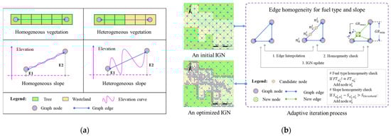 IGN adaptive optimization. (a) Homogeneity and heterogeneity in fuel and slope; (b) adaptive iteration process for IGN optimization.