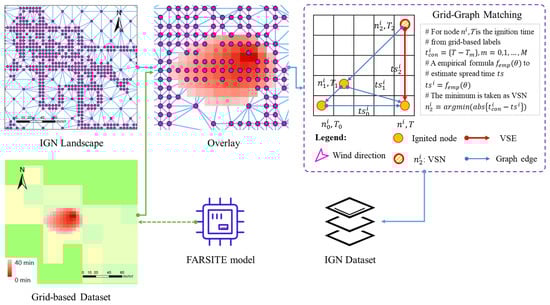 To convert these grid-based simulations into graph-based simulations, a Grid-Graph matching method is implemented for the graph landscape, as Figure 4 shown. Based on the same coordinate system, the IGN is overlaid with the grid-based simulations. Then, we map the ignition time property of the grid to the graph node at the corresponding position. Thus, the graph node becomes equipped with the ignition time label. Next, an empirical VSE extraction method is adopted to determine the VSNs and VSEs in these labeled graph nodes. Suppose that node is a labeled graph node with ignition time , its connected nodes is , the ignition time of is , and +1 is the number of connected nodes. Thus, the spread time from to node can be calculated as . If is greater than 0, it means that node is ignited after the connected node , and vice versa. Then, we remove these nodes with < 0 as they are ignited later and impossible to ignite the node . When dealing with the complex landscape, it is difficult to infer the VSN based on ignition time alone since the VSN is determined by both ignition time and spread time, as discussed in Section 4.3. Thus, the empirical formulas in the grid-based model [] is adopted to calculate the spread time of graph edges . Due to the differences in landscape representations, it is natural that there is an offset between and . We think this offset of the VSE is the minimum relative to other connected edges. The details of the Grid-Graph matching algorithm can be found in the pseudo-code in Appendix C. Take the demo in Figure 4 as an example, the offset in and () is the minimum, the node is taken as the VSN of node , the edge formed by node and the VSN is defined as the VSE. We notice that is similar to , as node and node are almost ignited by the node at almost the same moment. Here, node is not taken as the VSN, as the spread time from node to node is much greater than () while the wind direction is 45°. Finally, based on the empirical method, total 65,505 VSEs are extracted from the 700 grid-based labels. To train the WFDNN, we adopt a 4:1 ratio to divide the VSEs in the IGN dataset into 52,404 training VSEs and 13,101 test VSEs, respectively.