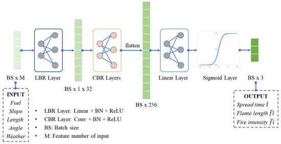 This hybrid layer maps the input tensors (BS × 1 × M) to a high-order tensor (BS × 1 × 32), where BS is the batch size and set as 32, and M is the feature number of the VSE and determined by Equation (6). The second hybrid layer contains five CBR (Conv + BN + ReLU) layers; each CBR layer is composed of a convolution (Conv) layer, a batch normalization (BN) layer, and a ReLU layer. The convolution layer [] is implemented with local connectivity and weight sharing to extract features from the input tensor. As the number of convolutional layers increases, deeper features of the input tensor can be extracted. The first CBR layer is designed to generate the higher-order features (BS × 32 × 32), and the remaining four CBR layers are implemented with the same kernel number and extract deeper features (BS × 64 × 4). The last linear layer and sigmoid layer are designed to regress a prediction tensor (BS × 3), consisting of the spread time , the flame length , the fire intensity of the input graph edges. The sigmoid layer [] is another type of activation function and converts any input into a value between 0 to 1, as defined in Equation (10).