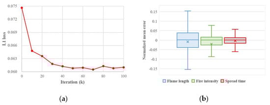 The deep neural network WFDNN is implemented by PyTorch; the initial learning rate is 0.001, the optimizer is Adam, and the loss function is L1 loss. After 100,000 iterations, the WFDNN converges with a loss value of 0.061, as shown in Figure 6a. On the test dataset, the trained WFDNN shows competitive performance compared with the FARSITE model and CA model. The inference time is 0.0017 s for each sample, and the mean absolute error is 0.936 min, 0.895 feet, and 177.2 kw/m on spread time, flame length, and fire intensity, respectively, as shown in Figure 6b.