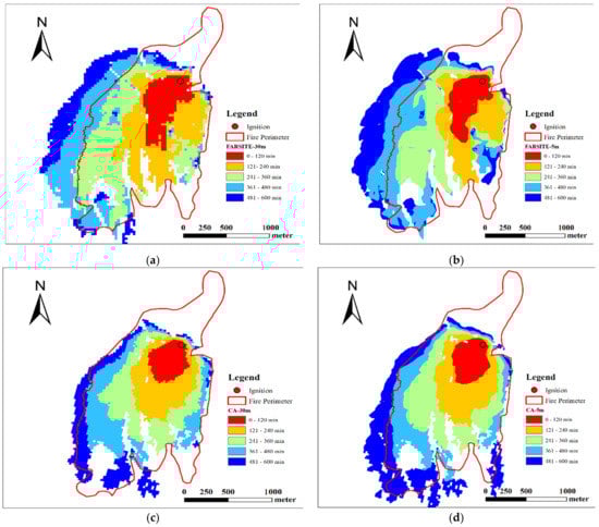The final wildfire perimeter recorded by GeoMAC [] was adopted to evaluate model performance. The perimeter area is about 704 acres, while the record in LAFD [] is near 800 acres at 600 min. This is mainly due to measurement errors and the difference in calculation methods of different government agencies. Additionally, it should be noted that the recorded area contains some measurement errors (the recorded area at 216 min and 281 min is the same, and at 406 and 446 min as well), as it is difficult to accurately obtain the area from the remote sensing imagery or GPS tracker, especially when the wildfire is still burning and spreading.