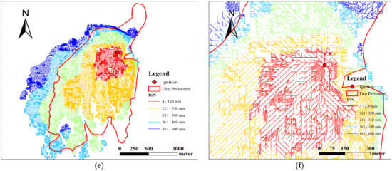 As shown in Figure 7, the simulation results of the above three models are displayed and categorized by a 2-h time interval. In terms of model refinement, the simulations with the high-resolution landscape are more refined than those with low resolution. They naturally contain more details about the wildfire spread process. In contrast, the IGN model adopts a variable scale landscape and demonstrates the spread of wildfire with a spatiotemporal spread route. Figure 7e shows the local route of IGN simulation, which clearly describes the fire spread from the ignition to the surrounding unburned area. Obviously, a higher refinement of the model will lead to lower computational efficiency. The runtimes of the above five scenarios (Figure 7a–d) are 15.864 s (FARSITE-30m), 45.809 s (FARSITE-5m), 0.954 s (CA-30m), 56.431 s (CA-5m), and 82.888 s (IGN), respectively. The higher refinement notably improves the model computation time. We should note that the runtime of the FARSITE model is sensitive to the “Perimeter Resolution (PR)” parameter. In the high-resolution scenario, when the PR is set to 30 m, 20 m, and 10 m, the simulation runtime is 45.809 s, 1 min 59.076 s, and 9 min 45.809 s, respectively. When the PR is set to 5 m, the FARSITE model cannot output the results within the limited hourly waiting time.