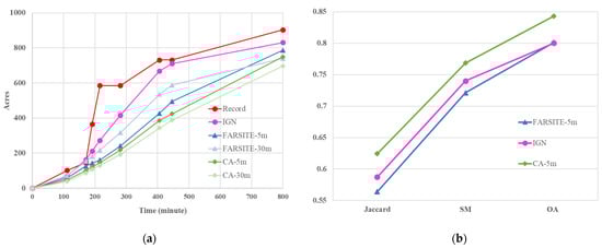 The burned area comparison of the above three models is presented in Figure 8a. The area of the record data (red line) increases steadily from 0 to 150 min, then grows rapidly from 150 to 200 min, and next turns slow until the wildfire is gradually under containment by firefighters. The IGN model (pink line) maintains the best performance with an average area error (AAE) of 109.43 and has the closest value with the record at any time (111 min: 33 acres, 171 min: 17 acres, 191 min: 153 acres, 216 min: 312 acres, 281 min: 169 acres, 406 min: 62 acres, and 446 min: 20 acres). At the same time, other models (FARSITE-5m, FARSITE-30m, CA-5m, and CA-30m) perform with AAE 277.43 acres, 171 acres, 257.29 acres, and 279.71 acres, respectively. The model performances with Jaccard, SM, and OA are illustrated in Figure 8b; three models all demonstrate competitive performance in the Getty Fire case. CA model has the best performance (Jaccard: 0.624, SM: 0.769, OA:0.843). Although the performance of the IGN model (Jaccard: 0.587, SM: 0.740, OA:0.800) is slightly lower than the CA model, it has an advantage over its baseline model, FARSITE model (Jaccard: 0.564, SM: 0.721, OA:0.801).