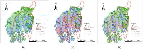 Wildfire spread characteristics in IGN-based landscape. (a) Spread rate; (b) flame length; (c) fire intensity.