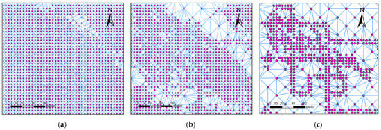 As shown in Figure 2, we set the maximum graph resolution and the minimum graph resolution . The is the shortest edge length in the IGN while the is the longest length. Uniform sampling with distance interval is adopted to initialize the spatial distribution of graph nodes. The Delaunay algorithm [,] is adopted to construct graph edges based on the spatial distribution of graph nodes. The edge property is critical to wildfire spread simulation as it determines the rate of spread. However, edge properties are likely to be heterogeneous and cannot be accurately defined; various fuel or variable slope may exist in a graph edge when the landscape is complex. Therefore, it is necessary to optimize the spatial distribution of graph nodes to ensure the homogeneity of graph edges.