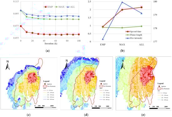 VSN and VSE are defined to describe the graph node that first ignites another node and the graph edge they form. However, it is not an easy task to determine the VSN and VSE when generating the IGN dataset from the grid-based dataset, as we only know the ignition time of the graph node and cannot accurately infer the VSN from the connected nodes. Therefore, we have proposed several methods to generate the IGN dataset, such as the empirical method (EMP), the maximum time method (MAX), and the all-extraction method (ALL). The empirical method is illustrated in Section 2.3.2, while the maximum time method thinks that the larger the ignition time difference between the nodes, the larger contribution of the ignition effect. Thus, this method considers the edge with the maximum spread time among all connected graph edges as the VSE. In contrast, the all-extraction method takes all graph edges with a spread time greater than zero as VSEs, as all connected edges are contributors to the ignition of the target node. Based on the above three methods, the number of generated VSEs in the IGN dataset is 65,505 (EMP), 80,821 (MAX), and 210,116 (ALL), respectively. Each dataset is randomly divided into training and testing sets according to the ratio of 4:1 and further adopted to train and test WFDNN. As Figure 11a,b shows, the empirical method converges faster and has the smallest loss value (EMP loss: 0.061, MAX loss: 0.086, ALL loss: 0.091). In addition, the empirical method maintains the advantage in test error of spread time (EMP loss: 0.936 min, MAX loss: 1.999 min, ALL loss: 2.147 min), flame length (EMP loss: 0.895 feet, MAX loss: 0.721 feet, ALL loss: 0.962 feet) and fire intensity (EMP loss: 177.2 kw/m, MAX loss: 180.0 kw/m, ALL loss: 179.1 kw/m). Moreover, the Getty Fire case was taken to compare the above three methods from a visual perspective, as shown in Figure 11c–e. Although there is only a slight difference in the values of the model training and testing, it is evident in the case that the simulation results of these methods have notable differences. These results show that WFDNN trained by the empirical method is able to simulate the wildfire and generate predictions that fit well with the recorded fire perimeter. However, the WFDNN performs poorly with the datasets constructed by the other two methods (MAX and ALL). The prediction results are significantly different from the real recorded perimeter, which indicates maximum time method and all-extraction method are inappropriate for application in actual wildfire spread prediction.
