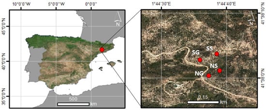 Soil is a nonrenewable natural resource, its formation and properties depending on multiple factors, including climate, topography, biological and human activity, lithology, and time []. Mediterranean areas of the Iberian Peninsula present a high vulnerability to degradation as a consequence of a climate and topography that favours erosive phenomena [,,]. Climate-change projections are highly unfavourable towards the maintenance and development of protective tree cover, as well as to the land-use change resulting from rural abandonment over the last few decades. This land-use change has led to an increase in shrub density and a homogenisation of the landscape, with the typical Catalonian landscape being a “mosaic” landscape with agricultural plots mixed with forest areas; therefore, it was more homogeneous than it is now, and this change has facilitated the occurrence and spread of severe fires [].