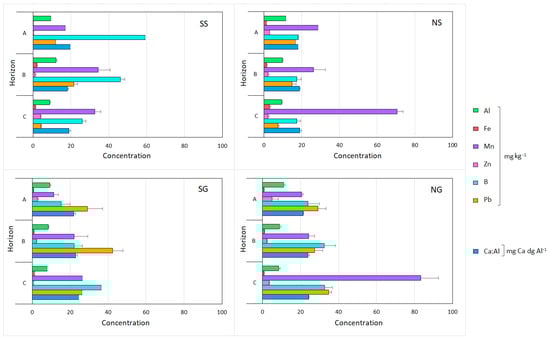 Mean concentration of the minor soil elements in different studied horizons of the analysed soil profiles (SS, NS, SG, and NG). Al, Fe, Mn, Zn, B, and Pb are expressed in mg kg-1, and Ca:Al in mg Ca dg Al-1.Profile.
