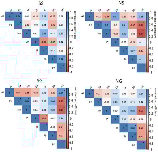 Correlation matrices for the different minor elements and pH, analysed by profile (SS, NS, SG, and NG). The values in the matrices are the Pearson correlation coefficients, calculated from the 11 soil characteristics obtained from each profile. Red cells—negative relationships; blue cells—positive correlations; asterisks—statistically significant correlations (p < 0.05).