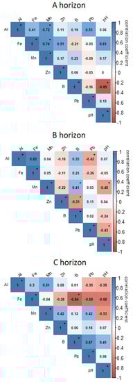 Correlation matrices for the different minor elements and pH analysed by master horizon (A, B, and C). The values in the matrices are the Pearson correlation coefficients, calculated from the 11 soil characteristics obtained from each profile. Red cells–negative relationships; blue cells–positive correlations; asterisks–statistically significant correlations (p < 0.05).