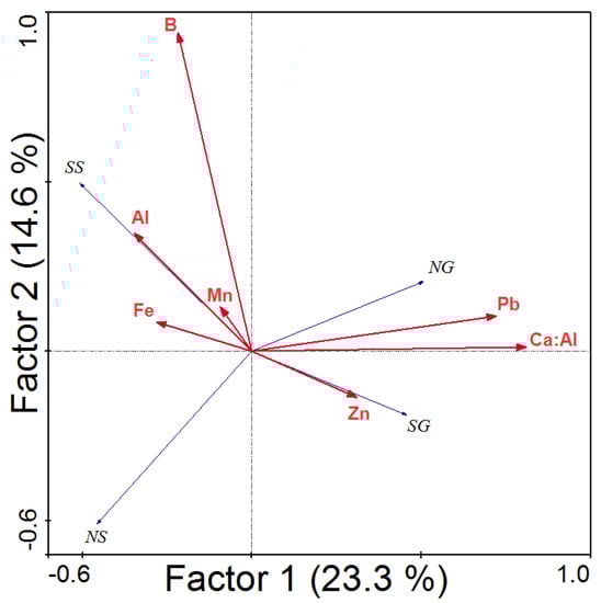We supplemented the correlation analysis with an RDA in order to determine the overall relationships between the minor elements analysed and the selected profiles by ordering them according to their linear relationships in relation to ordination factors (Figure 5). Our RDA explained 37.9% of the total variance, the first factor explaining 23.3% of the sample variance and the second factor explaining 14.6%. The RDA indicated that slope was more relevant than aspect in the ordination, the profiles with gentle slopes clearly being associated and increasing towards the positive part of Factor 1, whereas the profiles with steep slopes increased towards the negative part of Factor 1. The profiles with gentle slopes (SG and NG) were linked to higher Zn, Pb, and Ca:Al ratio values. To the contrary, the steep slope profiles (SS and NS) were associated with higher values of the other extractable elements (mainly Al, Fe, and Mn).