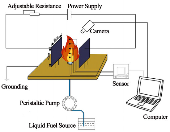 A flame is a weakly ionized plasma, in the role of the applied electric field its internal contains a large number of charged particles that will produce directional movement, and the formation of ionic wind, affecting the shape, stability, products, and other combustion characteristics of the flame [1,2,3,4,5]. The U.S. Defense Advanced Planning Agency (DARPA) has funded Harvard University’s White Edge Research Group to carry out research on electric field fire extinguishing technology [6], the results of which show that electric field fire extinguishing technology in limited space for small and medium-sized flame extinguishing effect is good but cannot be applied to and open areas of large firefighting work. While most of the ships and ships at sea are metal structures, the cabin space is closed and narrow, electric field fire extinguishing technology is an auxiliary means of fire extinguishing and because of its repeated work and no residual harmful substances after extinguishing [7,8,9], has a greater prospect of application on surface ships [10]. The current research on electric field-driven flame dynamics is mostly focused on the influence of the electric field on the combustion characteristics of small flames, and less on the medium-sized flame combustion characteristics affected by the electric field and focus on the electric field on the flame of the direction of the promotion of combustion, stable combustion effect research, electric field fire extinguishing effect of research is scarce. The study of the flame quenching process caused by the application of a uniform transverse AC electric field can help to understand the mechanism of electric field fire extinguishing and has important significance for the design and development of marine electric field fire extinguishing devices.