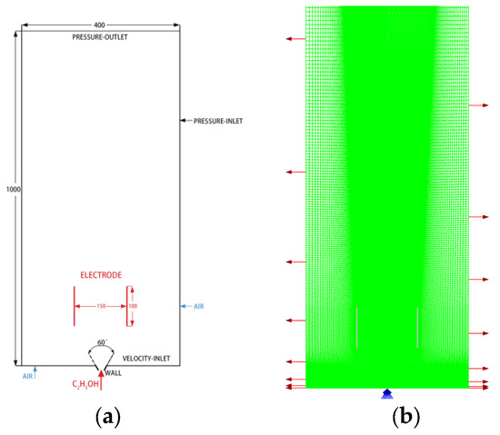 In China, Yunhua Gan and Yanlai Luo [17,18,19,20] explored the combustion characteristics and chemical reaction mechanism of ethanol–air non-premixed combustion flame under the action of the electric field and proposed a detailed chemical reaction mechanism of ethanol–air flame combustion containing charged particles based on the skeleton mechanism of the basic properties of combustion in methane–air flame proposed by Belhi, which contains 64 components and 423 reactions. Di Renzo et al. [21,22] combined Belhi’s results to develop a spatial model of counter-current diffusion flame mixing fraction with a sub-breakdown electric field, and the computational results of this two-dimensional model agreed well with experimental data and significantly reduced computational costs. Research results [23,24], simulated the ethylene diffusion flame containing charged particles, and the flow of smoke particles in the flame under DC electric field.