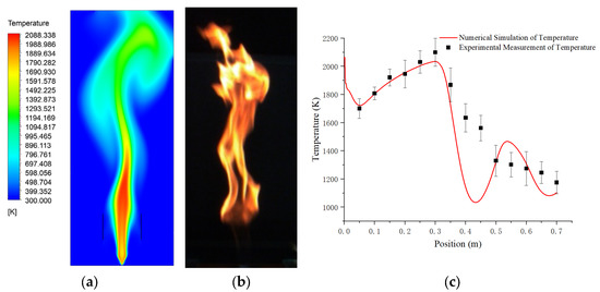 Contour of flame temperature and flame image in the experiment without electric field. (a) Flame temperature clouds; (b) experimental flame image; (c) comparison of simulated temperature distribution with experimentally measured temperature.