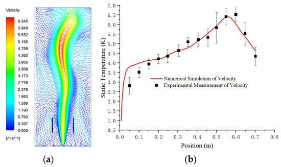 Prediction of flow velocity in combustion zone and experimental measurement data. (a) Flow field velocity vector diagram; (b) comparison of predicted flow rates with experimental measurement data.