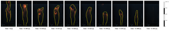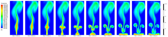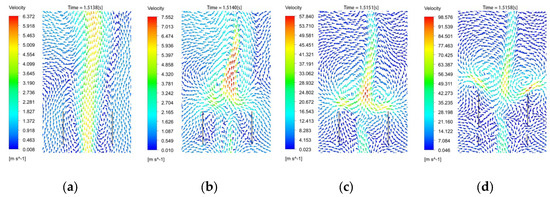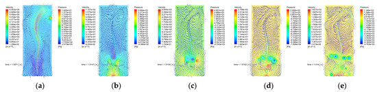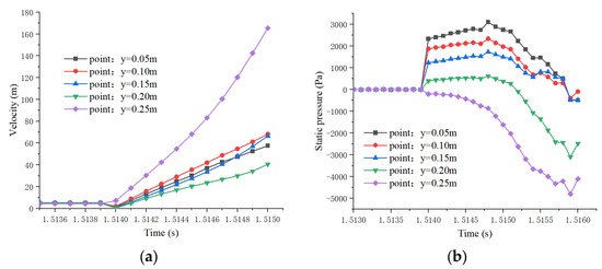 According to Equation (10), as C, remains constant, the pressure per unit volume of fluid decreases as the flow rate within the combustion field increases. A local low-pressure zone is formed at the 0.25 m detection point attachment above the nozzle as shown in Figure 9b. The appearance of the local low pressure resulted in the external fluid being sucked into the low-pressure area and forming a hedge with the rising fluid between the pole plates as shown in Figure 9c,d, the hedge of the fluid also resulted in, a reduction in the velocity of the flow field between the pole plates and a rise in static pressure at the remaining four detection points as shown in Figure 10a when the static pressure at the 0.25 m monitoring point above the burner nozzle continued to fall during the period 1.5139 s–1.5147 s.