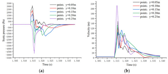 (a) Variation of static pressure with time at points 0.05 m, 0.10 m, 0.15 m, 0.2 m, 0.25 m above the burner nozzle; (b) variation of velocity with time at points 0.05 m, 0.10 m, 0.15 m, 0.2 m, 0.25 m above the burner nozzle.