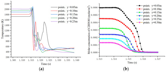 (a) Temperature change over time at each monitoring point; (b) ethanol concentration change over time at each monitoring point.