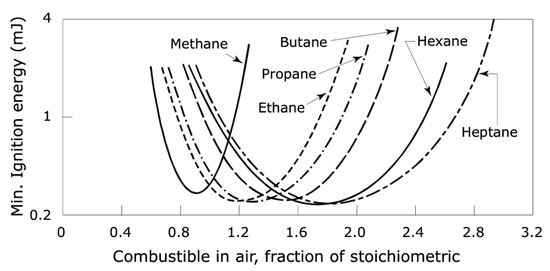 In later research, Zborovszky [54] found that about 5 W is the minimum power needed to ignite methane–air mixtures (Figure 8). In another series of tests [26], she found that, for resistive circuits over a sizable range of voltages, conditions leading to ignition of atmospheres containing 8.3% methane in air entailed power levels varying over the range of 3.2–3.9 W. Consequently, her very early estimate [41] that 0.3 mW is the minimum power required for the ignition of methane/air atmospheres appears questionable.