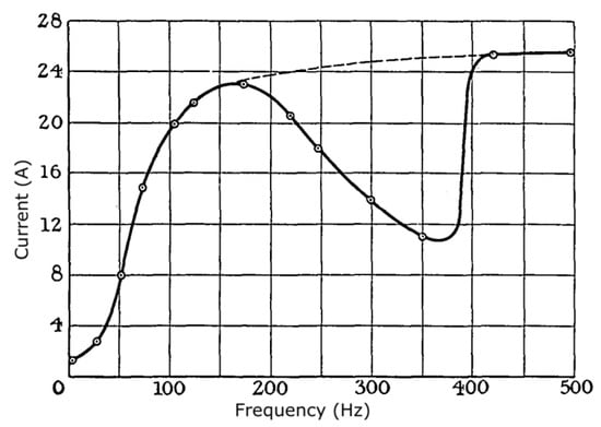 In early research (1924), Thornton [31] provided data showing that ignition from DC currents is easiest, and that progressively higher voltages or currents are required as the frequency is raised from 0 to 160 Hz. However, for 160–415 Hz there was a U-shaped response, although beyond 415 Hz frequency appears to have but little effect (Figure 3). Thornton considered that the initial increase in ignition difficulty with increasing frequency is due to heating of the electrodes, with more rapid polarity reversal leading to lower ability to provide sustained heating. The dip he considered to be due to competition between effects of ionization versus thermal heating. He also noted that the dip effect was not as pronounced with some other gases. Later research [32,33] indicates that actual performance seems to heavily depend on the test details, including parasitic reactances, and that DC conditions may or may not be more incendive than AC. The research by Allsop and Guénault [34] indicates that there may be a significant frequency effect if inductance is not minimized, but a negligible one in resistive circuits. Thus, this again is an area where guidance is inadequate, since research findings are limited and conflicted.