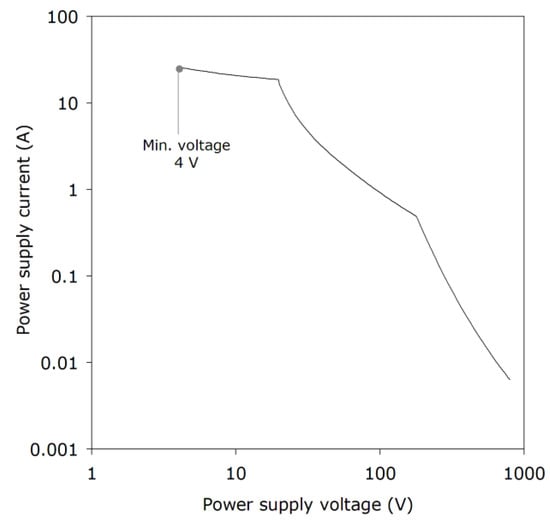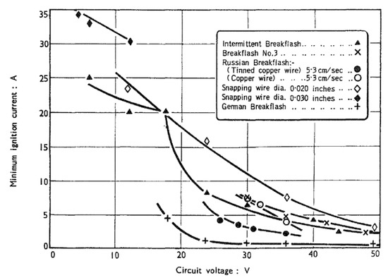 Figure 6 shows some additional results obtained in the similar SMRE test rig [44]. The results should be viewed as indicative and not absolute, since different values are found using different test rigs [45,46] The 4 V value for minimum voltage is a very low value for this type of experiment and more commonly a lower limit of 8–15 V has been found in purely resistive circuits. In inductive circuits, however, ignitions have been reported at the 0.5 V level [47], and lower-yet values are not precluded. In Figure 6, there is an inverse relationship between voltage and current, suggesting that—under the test conditions considered—there may be, at least approximately, a power limit.