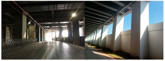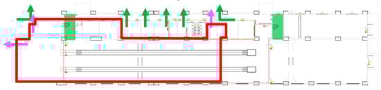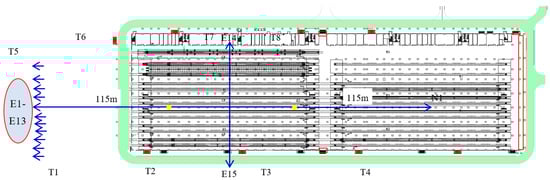 There are generally three methods for calculating the evacuation action time: the field simulation test measurement method, the empirical formula method, and the computer simulation method. The method of on-site simulation test measurement is mainly used for scientific research and is rarely used in engineering applications due to the limitation of funds and test conditions; evacuation prediction is carried out by manual calculation, and some countries represented by Japan mainly use this method; the computer simulation method uses computer software to simulate the dynamic process of personnel evacuation to predict the process and time of personnel evacuation movement. At present, there are mainly network models. There are two simulation models, thenetwork model and the fine mesh model. The calculation of the evacuation action time of this project uses STEPS simulation software for calculation []. The analysis tool used in the simulation’s analysis of personnel evacuation action time is Pathfinder personnel evacuation commercial software, which is a brand-new evacuation simulator that is different from traditional software based on fluid flow calculation [,]. Based on computer science in the field of graphic image technology, Pathfinder achieves accurate predictions of how each individual moves. The engineering garage is mainly used for water supply, refueling and general troubleshooting. There are few personnel. The personnel in the engineering garage are evacuated through the fireproof insulation board [,,]. They can be evacuated to the surrounding fireproof insulation board through the surrounding evacuation doors, and then evacuated to the outside of the cover, an outdoor environment as shown in Figure 5. The distance from the evacuation door of the engineering garage to the fireproof insulation board should not be greater than 15 m.