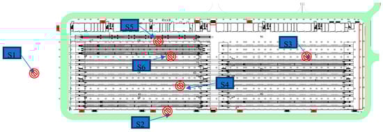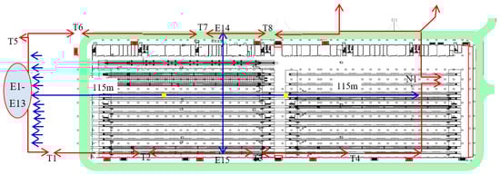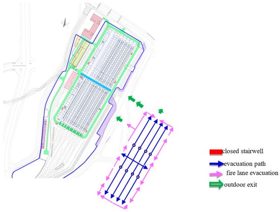 The evacuation exits of the operating warehouse are located around the building. The specific evacuation exit location, evacuation direction, and width statistics are shown in Figure 8 and Table 7.