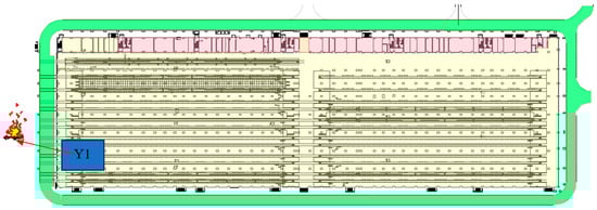 The length of the evacuation movement time is related to parameters such as the length, width, number of personnel, and travel speed of the evacuation passage in the building. The speed of human travel is related to population density, age, and flexibility. When the density of people is less than 0.5 people/m2, the traveling speed of the crowd on level ground can reach 70m/min without crowding, and the speed of descending the stairs can reach 51–63 m/min [,,]. On the contrary, when the population density is greater than 3.5 people/m2, the crowd is very crowded and can hardly move. In addition, referring to the provisions of 5.5.16 of the “Code for Fire Protection of Building Design” (GB50016-2014 (2018 edition)), the personnel flow per share on flat sloped ground is 43 people/min, and the personnel flow per share on stepped ground is 37 people/min. Thus, the flow of people per minute per meter’s widths (i.e., outflow coefficient) are 43/0.55 = 78 (people) and 37/0.55 = 67 (people), respectively [,,,]. The general principle of evacuation scene design is to find out the most unfavorable situation for the safe evacuation of personnel after a fire occurs. The personnel evacuation scenarios of this project are set as shown in Table 10 and Table 11. Figure 9 and Figure 10 show the evacuation scenario diagram and fire scene location: