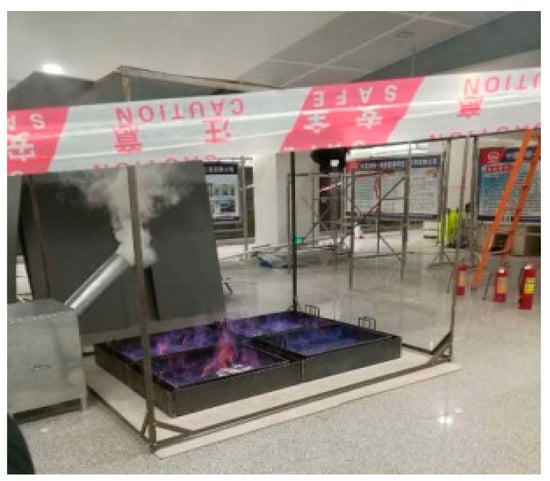 In this study, a hot smoke test was conducted on an underground fireproof insulation board. The fire source system was used to generate hot flue gas with preset fire power, including burner, flue gas generator and flue gas generating box, and protective device. Since the fire source was arranged in the most unfavorable position of the garage area, the track area and the fireproof insulation board, this point was the most unfavorable to the evacuation of personnel and posed the greatest danger to personnel. Therefore, each relevant test point was arranged near the fire source, the evacuation path and the smoke outlet, so as to obtain the distribution of relevant risk indicators. The middle position of two adjacent lighting ventilation shafts (that is, the most unfavorable point for natural smoke exhaust; the distance from the lighting ventilation shaft was 30 m) was selected as the smoke emission test point, the fire source was a diesel pan of 1.82 m2, the fire heat release rate was 2.5 MW, and the smoke exhaust test was carried out under two working conditions (the height of the oil pan from the ground was 1.3 m and 0.1 m, respectively), and the combustion time was about 12 min each time [].