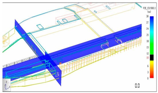 Consider the unfavorable situation of a 10.5 MW train fire occurring on the south side of the warehouse, and the mechanical smoke exhaust system failing; after the fire, the flue gas rises to the ceiling of the use storehouse, settles continuously, and generates a ceiling jet to the surrounding area in Table 12. Due to the large area and high net height of the use storehouse, and because there is no separation measure on the north side, the effect of diluting the flue gas is better. The flue gas is continuously replenished and entrained by fresh air, and spreads to the entire application warehouse by thermal buoyancy, and a large amount of flue gas is discharged outdoors through the north cover. In Figure 11, under the action of hot air pressure, a small amount of smoke passes through the hole; spread along the cover plate to the throat area, the smoke can be discharged through the throat area top hole. It extends about 150 m to the throat region, and later stage smoke concentration is lower. At this length, the natural flue gas emission can be satisfied by increasing the current net flow area. By 1800 s, the visibility of other areas at a distance of 4 m from the ground is greater than 10 m except near the fire source; by 1800 s, except for the local area near the fire source and the northern corner, in other areas the temperature at 4 m from the ground is less than 60 °C in Figure 12.