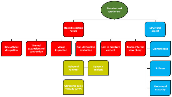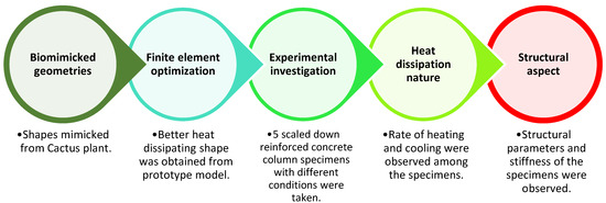 Improvements in the fire resistance of columns and frames provide a significant contribution to the overall durability of the structure under fire [36,37,38,39,40,41]. Most of the conventional fire protection and resistance techniques involve adding another material, which eventually increases the cost. As a result, this work experimentally analyses the nature of heat dissipation through biomimetic geometry over a reinforced concrete column. The crucial novelty of this research is applying the heat dissipation nature of a cactus plant to a reinforced concrete column. This eventually protects the column by dissipating the heat through the altered geometry at the top, made from the same concrete material.