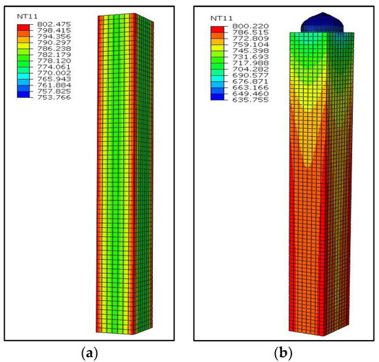 where is the concrete’s density, is the thermal conductivity, is the specific heat, is the convection coefficient, which equals 25 W/m2K, is the temperature of the fire curve, is the temperature at the concrete surface, σ is the Stefan–Boltzmann constant, and is the concrete surface emissivity (0.7) [23].