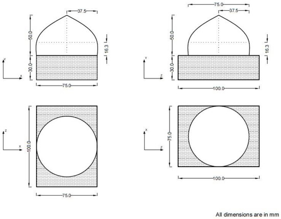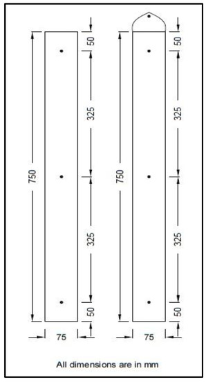 A scaled-down model of a reinforced concrete column was considered to validate the effect of heat dissipation in the mimicked column through experiments. For experimental purposes, the columns were scaled down to a ratio of 1:4 from the prototype model. The scaled-down model has a cross-section of 75 × 100 mm and a height of 750 mm. It comprises 4 numbers of 6 mm diameter bars as the main reinforcement and 6 mm lateral ties as a spacing of 50 mm C/C. For the mimicked shape, the mold was prepared using mild steel. A wooden mold was prepared for the columns. The mimicked part was attached to the wooden mold at the top through bolts. The dimensions of the scaled-down mimicked shape are given in Figure 11.
