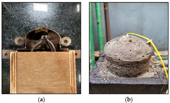 The black dots represent the thermocouples that were placed inside the columns. The thermocouples were inserted through the fresh concrete after placing it. Holes were drilled in the wooden mold at a specified distance to insert the thermocouples. For columns C3 and C4, the main reinforcements were extended to the mimicked part, as shown in Figure 14a.