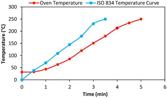 Comparison of the rise in an oven temperature and ISO 834 standard fire curve up to 250 °C.
