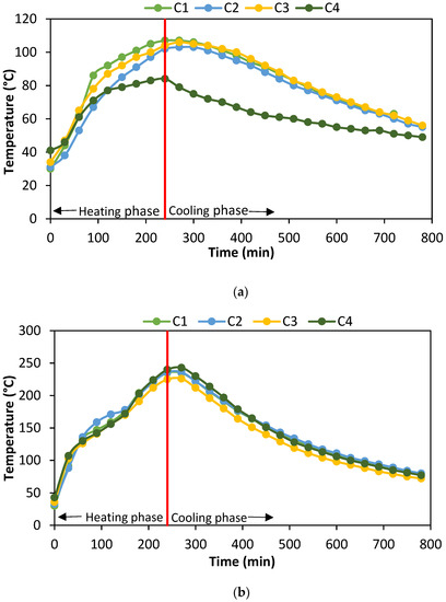 Time versus temperature curves were plotted based on the temperature recorded in the top, middle, bottom, and mimicked cone parts, and are represented in Figure 17.