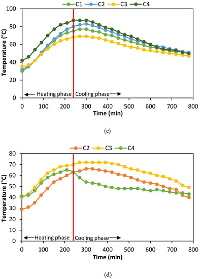A good heat-dissipating character shows a slower rise in temperature while heating and faster fall in temperature while cooling. While heating, it can be seen that the mimicked geometries have slower rising rates than specimen C1. While cooling, specimens C1, C2, and C3 follow almost similar rates except C4. The middle and bottom portions of C4 have higher rates than the top region when compared to other specimens. The heat accumulated in the middle and bottom regions was constantly released toward the top and resulted in a lower falling rate at the top. While cooling, the temperature at the top was almost constant for a longer duration. Meanwhile, there was a faster reduction in temperature in the middle and bottom regions. This shows the heat flow toward the top and the mimicked part trying to maintain the same temperature throughout the specimen. The temperature rise in the specimens at the top, middle, bottom, and cone regions every hour is represented in Figure 19.