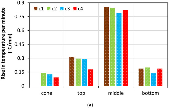 The time versus temperature curves exhibit similar characteristics between the specimens throughout the heating phase. C4 has a slight drop in the temperature over the mimicked cone part and in the top region as a result of quenching. The dissipation of heat in the top region was obvious as a result of quenching in the cone part. For better understanding, the rate of temperature rise per minute under heating and the rate of temperature fall per minute under the cooling phase are computed and represented in Figure 18. The rate of temperature per minute was calculated by the maximum temperature reached while heating or cooling, with respect to the corresponding time in minutes.
