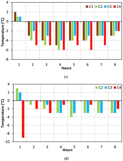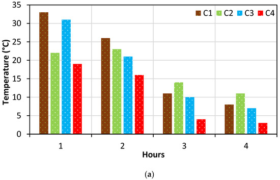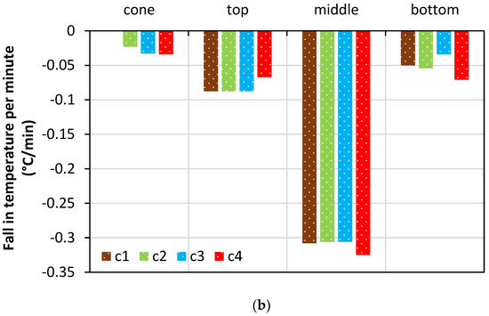 The rate of temperature fall in the specimens every hour at the (a) top, (b) middle, (c) bottom, and (d) cone.