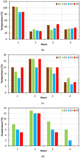 Temperature rise in the specimens every hour at (a) top, (b) middle, (c) and bottom (d) cone.