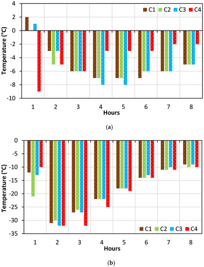 While heating, the temperature rise of specimens C3 and C4 in the top region was very low, but the temperature rise in the middle and bottom regions was greater than that of the other specimens. The opposite condition occurred for specimens C1 and C2 with respect to C3 and C4. Specimens C3 and C4 have rebar connected from the main reinforcements, which results in good dissipation of heat at the top region. Meanwhile, the middle region, which is heated the most, transfers the heat accumulated in the middle and bottom regions toward the top. This makes the top region stay at a specific temperature for a longer duration, neither increasing or dropping. The absence of cones or cones with rebar in specimen C1 does not allow the temperature to flow toward the top or other regions. C2 has a shape that has no rebar extended toward the cone and dissipates less than C3 and C4. In fact, the heat transfer is predominantly based on the conductivity of the material. Steel has better conductance than concrete, which helps specimens C3 and C4 dissipate more heat than C2, which has no rebar extended toward the cone. Hence, specimens C3 and C4 exhibit better heat dissipation than the other specimens. The temperature rise per hour in the cone region clearly depicts the effect of heat dissipation. The presence of extended rebar at the cone region does not allow the temperature to rise as it was maintained at a constant rate. The rate of temperature decreases every hour, while cooling in the top, middle, bottom, and cone regions for the specimens is represented in Figure 20.
