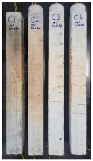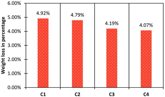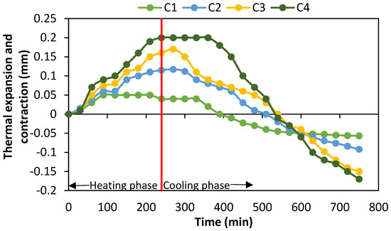 The LVDT readings exhibit thermal expansion due to heat and contraction due to cooling. Whenever an element is subjected to high temperature, it will undergo expansion as a result of heat release. This heat release will produce thermal stresses, and these stresses will be released by forming cracks over the surface. Therefore, the maximum expanded element will undergo maximum contraction [52]. From the curves, it was clear that the most heat dissipated specimen was C4 as it underwent the maximum expansion and contraction. Specimen C1 underwent the least expansion and contraction, thus proving the lowest heat dissipation characteristics. Specimens C2 and C3 fall next to specimen C1 in terms of heat dissipation. The thermal expansion and contraction subjected to time are shown in Figure 21.
