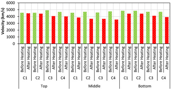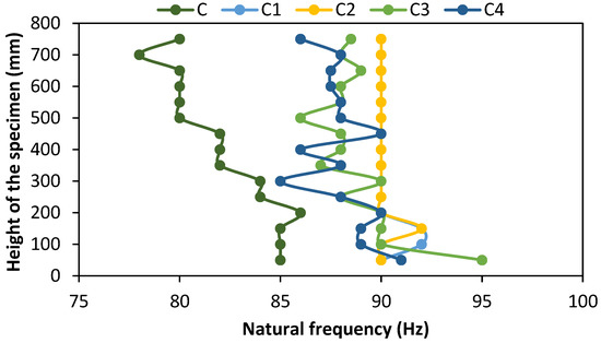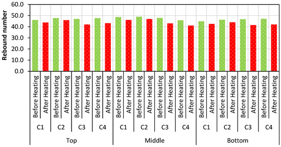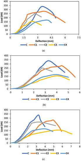 The nonheated column is almost uniform throughout the height. The differential heating condition created a nonuniform stiffness throughout the height of the heated column except for specimen C4. The stiffness of specimen C4 is similar to that of the nonheated column. Quantitatively, the stiffness of specimen C4 was less but followed a similar trend. The quenching effect reduces the overall stiffness but helps in distributing the temperature throughout the height, which subsequently maintains the uniform stiffness [56,57]. The failure of the specimens can be easily predicted for specimens that have uniform stiffness rather than nonuniform stiffness. This nonuniform stiffness could affect the stability of the column in the postfire condition.