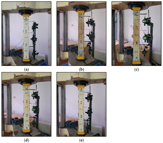 A schematic test setup for conventional and mimicked columns is represented in Figure 15. The setup was arranged in a column testing frame. The heating element was placed inside the column testing frame using a support bar. The specimen was inserted into the heating element from the top, and the specimen was placed over the dummy support. The specimen was placed inside the heating element in such a way that the sides of the specimen did not make any contact with the inner side of the heating element. The specimen was packed with glass wool near the top and bottom entry regions of the heating element to minimize the heat loss. All thermocouples were attached to the temperature indicator. An LVDT was set at the top to measure the expansion and contraction of the specimen under the influence of high temperature.