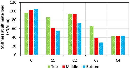 Based on the ultimate load and deformation, the stiffness was calculated and is represented in Figure 37.