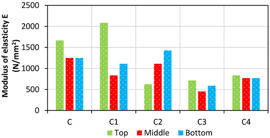 Modulus of elasticity of the specimens at the top, middle, and bottom regions.