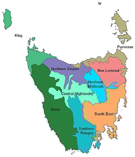 We chose Tasmania as the study area to validate the proposed idea of characterizing geographical regions into different risk zones by using spatial clustering. The choice was made for several reasons that include the frequent occurrence of wildfires in the region, the prevalence of readily available high-quality land datasets for the region that are usable in operational wildfire simulation tools, and a well-studied and systematic grid configuration of fire start locations in the region [,]. For the 2018–2019 wildfire season, Tasmania recorded 841 wildfires that burnt 310,311 hectares of forest areas []. Tasmania boasts high-quality land datasets available from TFS and State Emergency Service (SES) []. The Tasmania Fire Service (TFS) has maintained a grid configuration of 68,048 possible fire start locations at an interval of 1 km irrespective of land. Any start locations falling on the water bodies are shifted to the nearest land location. The Interim Biogeographic Regionalization for Australia Version 7 (IBRA 7) [] divides Tasmania into nine different bioregions based on vegetation communities and ecosystems, which are shown in Figure 1.
